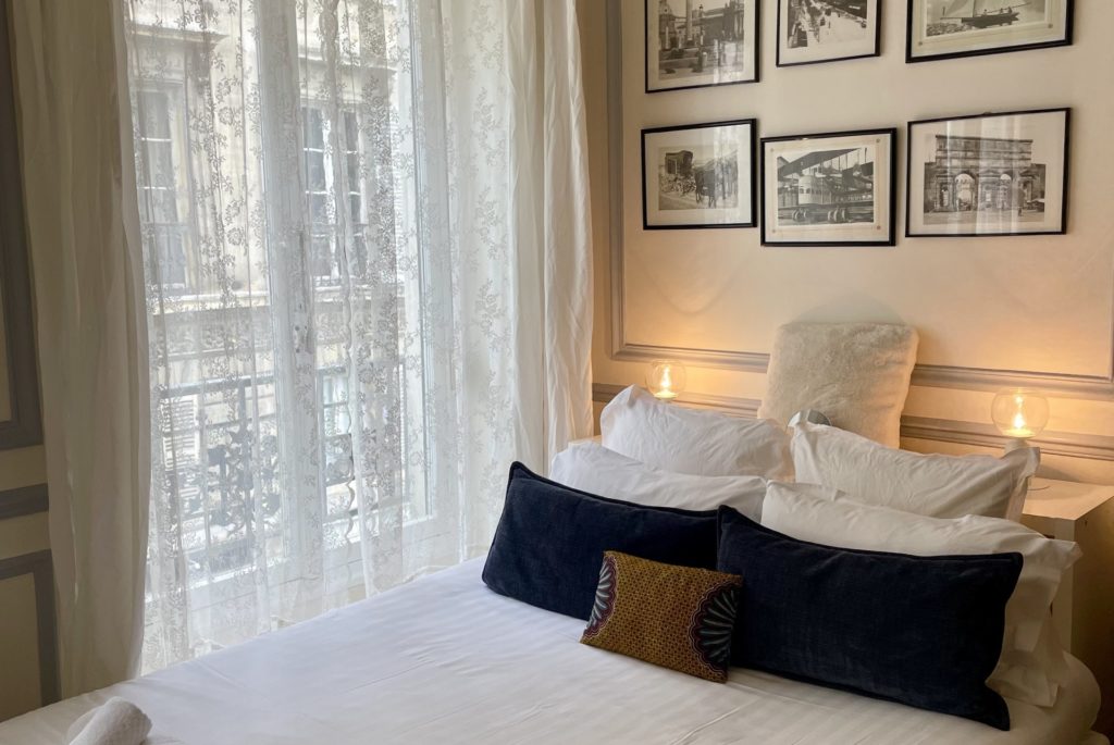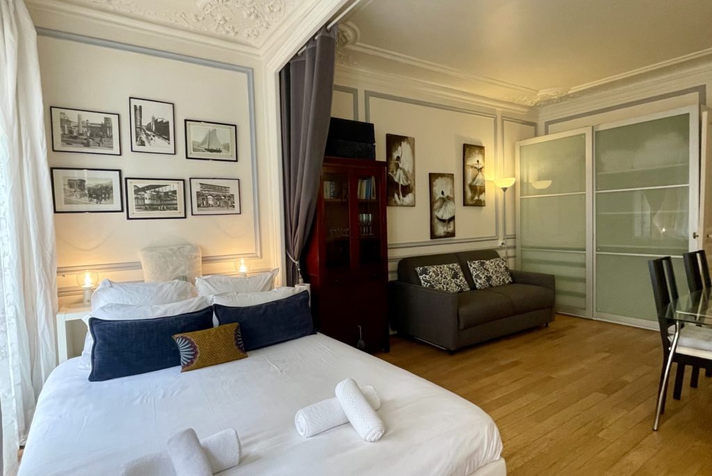Dans le salon se font face deux doubles canapés convertibles de 140 cm qui peuvent être isolés l'un de l'autre par un rideau séparateur. L'espace salle à manger comprend une grande table avec quatre chaises. Un coin bureau avec ordinateur confère un espace de travail. La salle de bains est composée d'une baignoire et des toilettes. Un charme suranné pour ce studio tout en moulures et cimaises dans le quartier de l'Opéra.