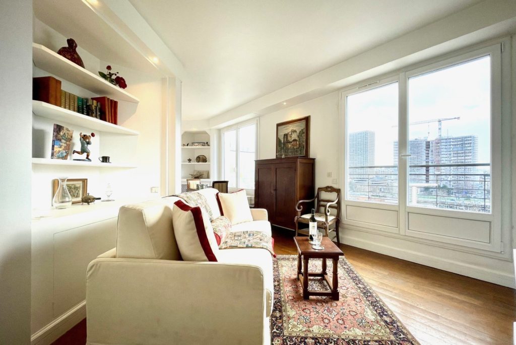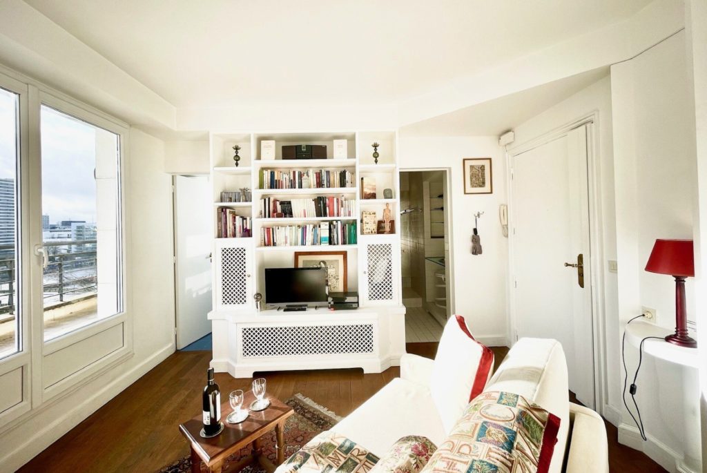 Ce studio de 40m² comporte un coin salon et un coin chambre, qui peuvent être séparée par une cloison. Le salon comprend un canapé, une télé, une petite bibliothèque et l'accès au grand balcon. Ce balcon donne une vue imprenable sur la Tour Eiffel, la Seine, la petite statue de la Liberté, le Sacré-Cœur au loin ainsi que sur les tours du quartier de Beaugrenelle. La chambre comprend un lit double et un espace de rangement.