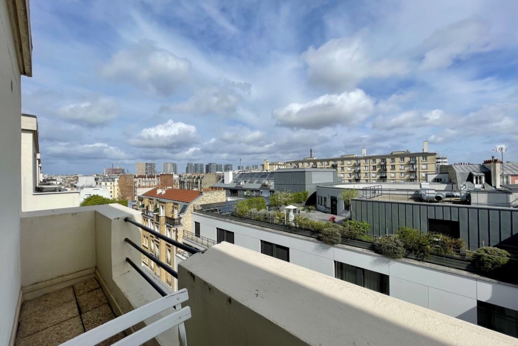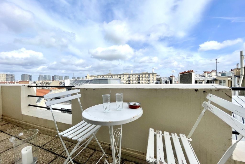 Avec sa belle vue à 180° sur les toits et sa petite table propice aux apéros sur le balcon, cet agréable appartement en enfilade se décline en intérieur et en extérieur. Le grand salon offre une atmosphère douce et tranquille avec ses couleurs douces bleues, grises et roses. De nombreux rangements se trouvent également dans la chambre.