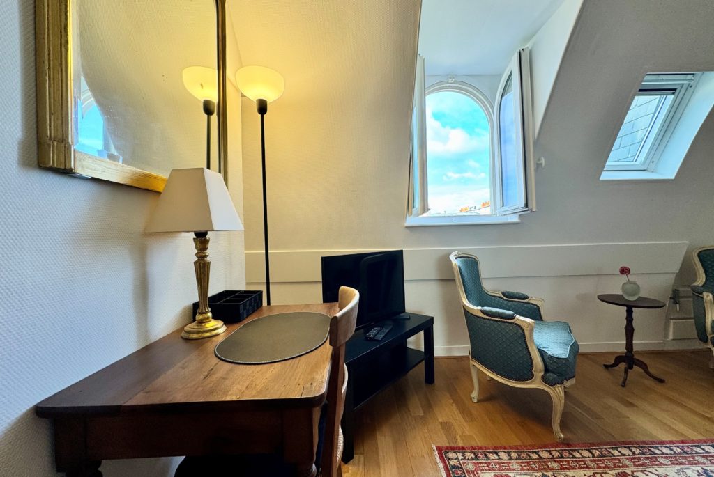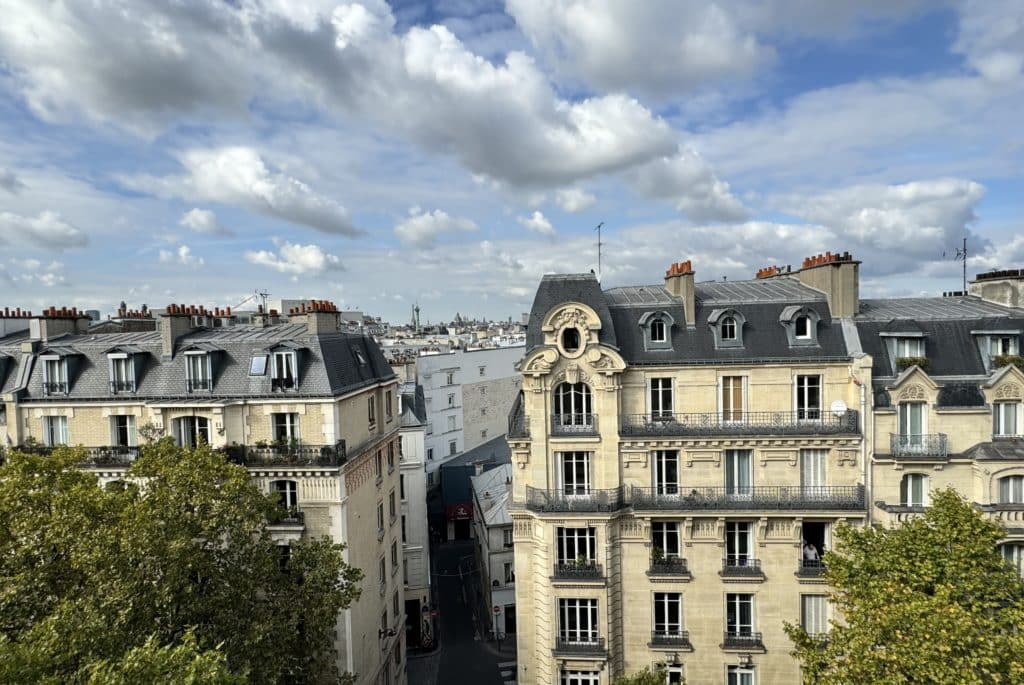 L’appartement se compose d’un séjour aménagé avec un canapé, deux fauteuils, une télévision, un espace repas pouvant accueillir jusqu’à quatre personnes, ainsi qu’un bureau idéal pour le télétravail. La cuisine, séparée et entièrement équipée (four, micro-ondes, réfrigérateur, bouilloire, machine à café, lave-linge…), bénéficie d’une belle luminosité, tout comme la première chambre, qui offre une superbe vue sur les toits de Paris. Cette chambre dispose de deux lits simples de 80 cm jumelables. La deuxième chambre est équipée d’un lit simple (90 cm) et d’un bureau. Elle offre une vue sur rue. La salle de bain, également très lumineuse, comprend une douche et un lavabo. Les toilettes sont indépendantes.