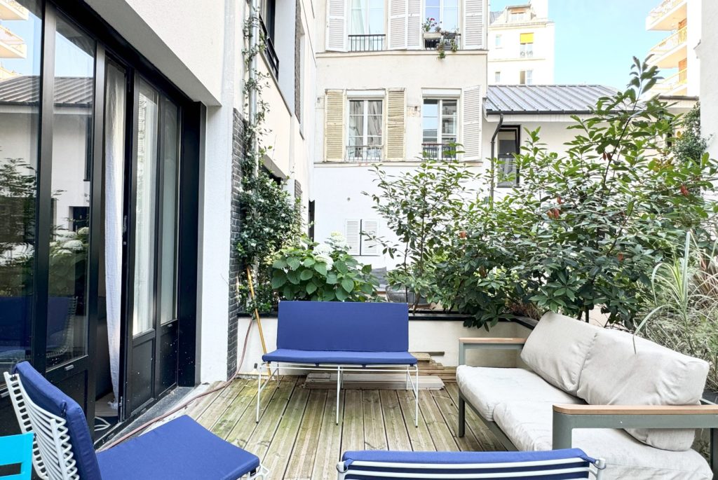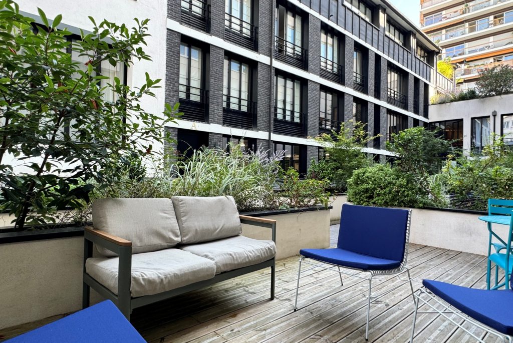 Ancien entrepôt de théâtre, cet immeuble a amorcé sa rénovation en 2020 mais conserve son aspect industriel avec ses verrières donnant sur les jardins du rez-de-chaussée. Il est sécurisé par deux portes d’entrée. L’appartement se situe au deuxième étage sans ascenseur.
