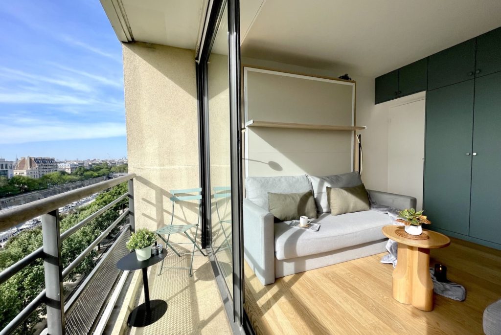 The modern bathroom includes a sink and a shower, and there is a small room dedicated to the laundry area, featuring a washing machine and a dryer, to make your daily life easier. The apartment offers an amazing view of the Seine and Paris, ideal for enjoying the beauty of the capital from the comfort of your home.