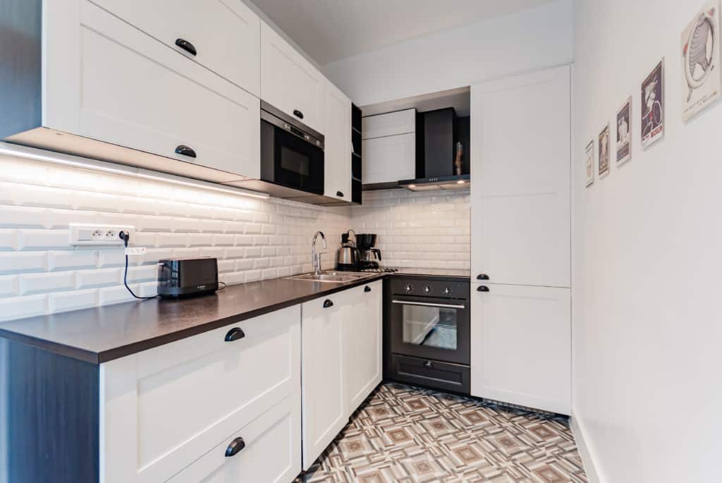 The living room is bright thanks to its 2 large windows leading to a small balcony, and it offers a 140 cm sofa bed, a TV, a dining table and a modern-designed table.